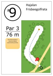 Ensimmäinen väylä on hyvä ja selkeä pelata. Väylät 2 ja 3 ovat puhtaasti sokkoväyliä, nämä voisi suunnitella kokonaan uusiksi. Tämän jälkeen edessä oli todella pitkä siirtymä, mutta nelonen löytyi lopulta uran varrelta vasemmalta puolelta. Loput väylät 4-9 ovat selkeitä metsäväyliä – lyhyttä neppiä, oikealle kaartuvaa, alamäkeä ja kunnon koukkua. Maasto oli paikoin todella hankala kävellä.