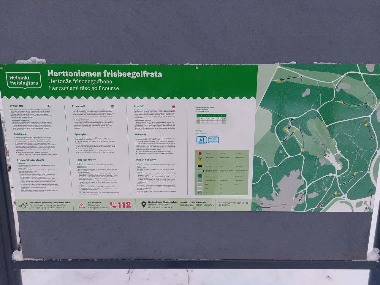 Talvipelattavuus ei tiedossa Herttoniemen urheilupuiston 9-väyläinen frisbeegolfrata.