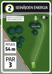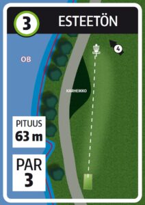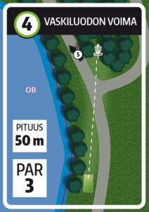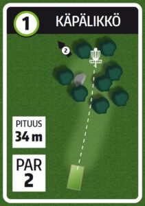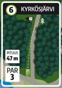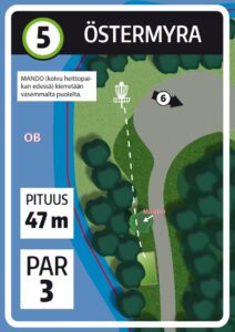 Hieman oli kuitenkin puutteitakin. 2/3-väylät olivat liian lähekkäin minkä kruunasi mandonuoli mikä ohjasi heittämään 2-väylän lopussa olleiden pensaiden oikealta puolelta suoraan kohden kolmosen heittopaikkaa. Täysin absurdi ratkaisu turvallisuuden kannalta. Jälkeenpäin karttaa tarkemmin tutkimalla heittosuunta ja samalla mandonuoli olisi ilmeisesti pitänyt osoittaa puskien vasemmalle puolelle mikä olisi loogisempaa, mutta silloinkin kori ja seuraava tee olisivat edelleen aivan liian likellä toisiaan. Liekö joku vandaali ollut tuossa asialla, tiedä näitä sitten… Erityisesti kolmosella pienoinen vaara kiekon joutumisesta veteen, jos heitto kovasti epäonnistuu ja kaartaa vasemmalle.