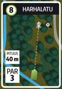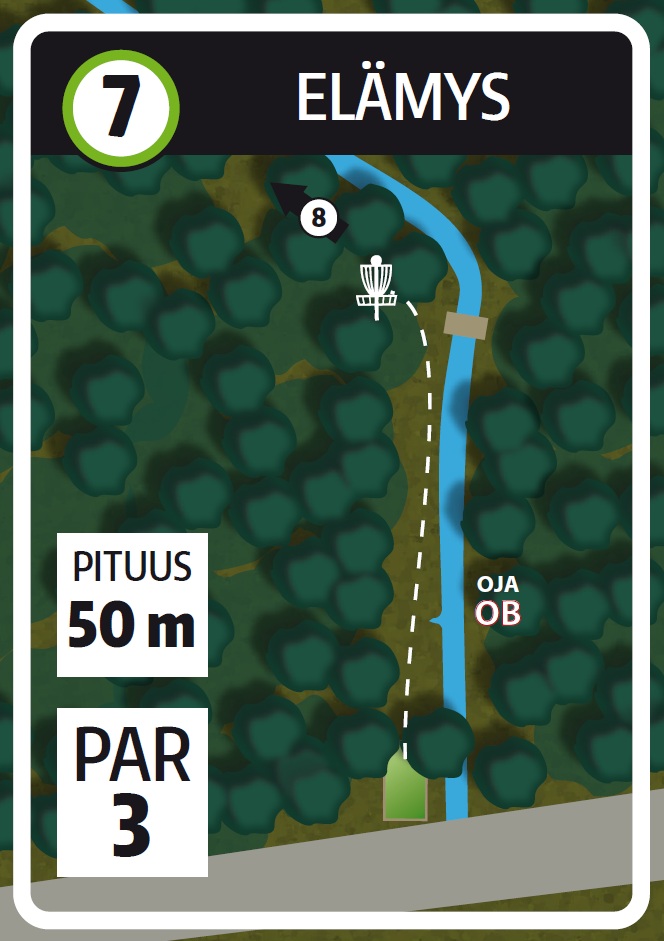 Metsäväylistä en osannut päättää, että oliko 7-väylä kohtuullinen ratkaisu vai täysi pannukakku. Sinällään ihan hieno kyllä, mutta oikean reunan mutavesilieju oja ei oikein hyvältä näyttänyt ja niin oma kiekkokin sinne liejuun lensi, tietenkin. Onneksi vettä oli suht vähän, joten kiekon sai ongittua hyvin pois. Aivan väylän alussa oikealla oli enemmänkin vettä. Itse en olisi tuollaista väylää lähtenyt kikkailemaan radalle, kun metsää olisi ollut aivan riittävästi tehdä hieman järkevämpikin väylä. 8-väylän heittolinjaa en oikein pienen mietinnänkään jälkeen hahmottanut, joten siinä pieni raivausoperaatio olisi ihan paikallaan.
