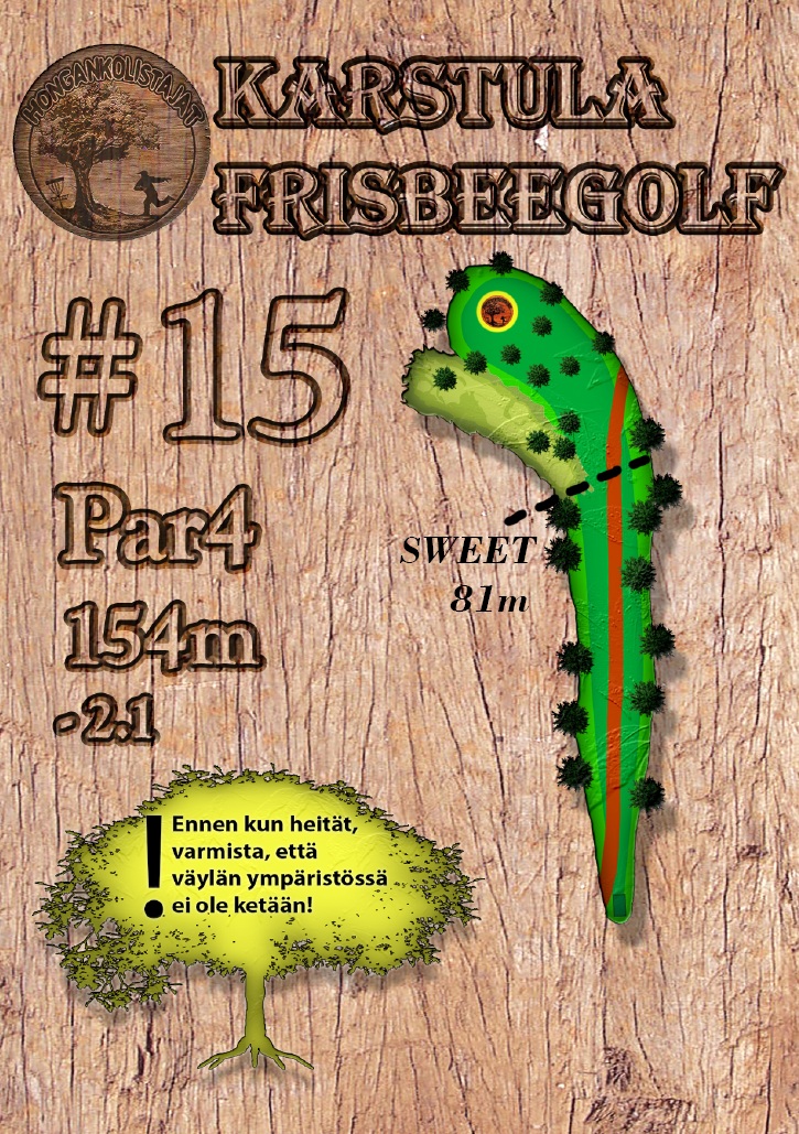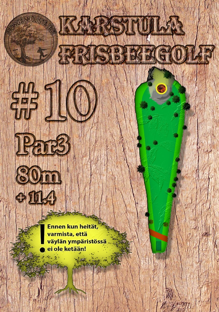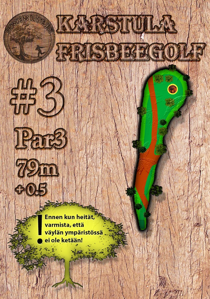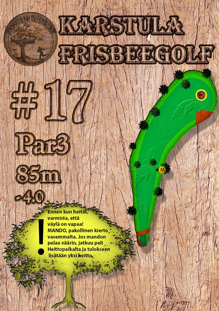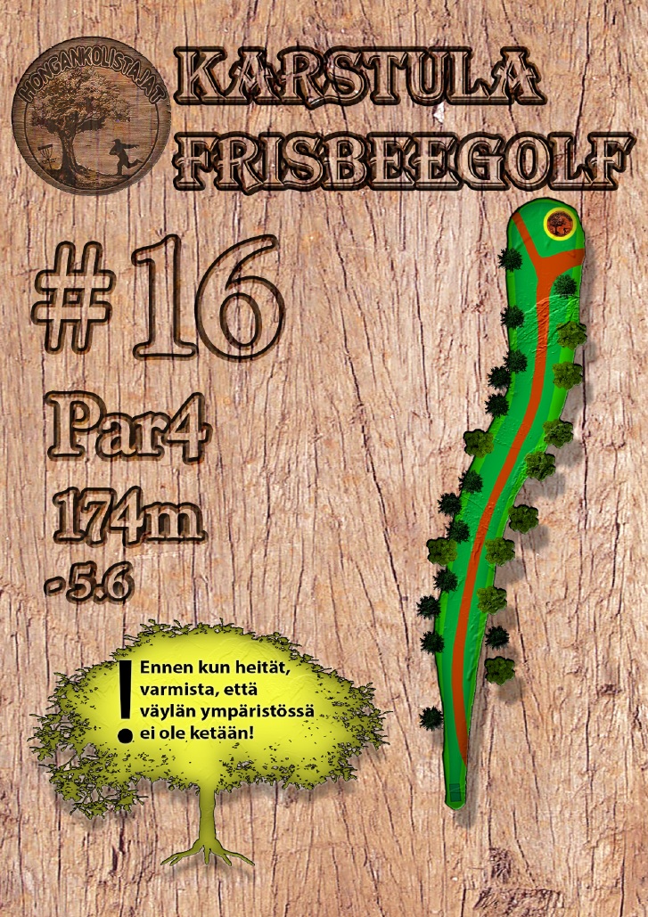 Karstulan rata sisälsi mukavasti korkeuseroja, joten hyvästä kuntoilusta kävi radan kiertäminen. Rata kiersi monipuolisesti erilaisissa ympäristöissä… välillä puistoa, välillä metsää ja välillä taas pururadan vartta. Hieno vesimaisemakin oli osin radalla läsnä. Kiekot löytyvät helposti. Väylät olivat vaihtelevia ja teknisiä ja tilaa oli pääsääntöisesti ilahduttavan paljon heittää. Siirtymät sopivia, ainoastaan 7 — 8 ja 14 — 15 hieman pidempiä. Siirtymistä kasille ysille mentäessä reitti oli varmasti yksi upeimmista mistä on radoilla koskaan kulkenut kallioiden välistä ylämäkeen. Väylistä suosikki nro 7 alamäkeen oikealle, puita haasteena. Samalla ko. väylä oli myös vaarallinen, sillä keskellä väylää meni kuntopolku ja puiden takia näkyväisyys nollassa, tarkka spottaaminen täysin välttämätöntä! Väylällä nro 10 kori oli nätisti kallion päällä ja nro 14 kori kallion edessä.