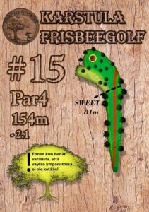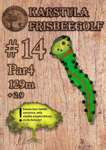 Radan rakenteet ja opasteet surkeassa jamassa. Isommalta tieltä oli opastetta, muttei kuitenkaan jostain syystä aivan perille asti mikä aiheutti hämmennystä. Infokartta roskiksineen tyydyttävä, ollut ”väliaikainen” ilmeisesti jo aika pitkään. Surkuhupaisaa oli osaltaan sekin, jotta löytökiekkolaatikko oli lukitsematon… Heittopaikat olivat kuopalla parin ensimmäisen väylän osalta eikä loputkaan ihan priimaa olleet. Korit ihan hyväkuntoiset suuntanuolineen, mutta heti alussa mentiin pieleen siltäkin osin. Avauksessa on hyvin helppo heittää vitosen korille kuten itsekin tein. Vitosen kori nimittäin loistaa keltaisen dgp-värisenä, mutta ykkösen harmaa ilmestys ei näy avauksessa yhtään mihinkään. Next tee -kylttejä ei ilmeisesti korinuolten takia ollut yhtään, virhe! Kylttejä olisi todellakin kaivannut ja karttaa sai tämän tästä vilkuilla esim. 5 — 6, 7 — 8 ja 14 — 15 siirtymillä. Vähän yhdellä sun toisella väylällä oli vieläkin hyvin märkiä kohtia eli rata kaipaisi aika ison määrän haketta ja/tai pitkoksia.