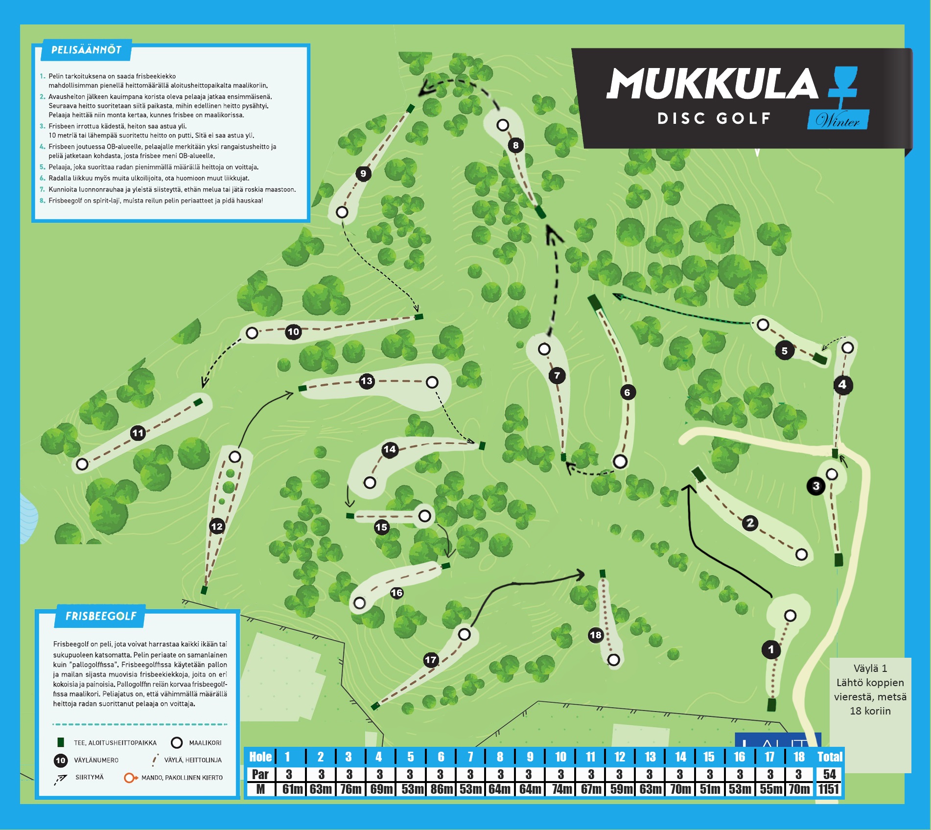 Pelattavissa talvella, ei talvikunnossapitoa Mukkula DiscgolfPark (Forest) on vuonna 2020 perustettu frisbeegolf rata. Mukkulan rata sijaitsee Rotarypuistossa.