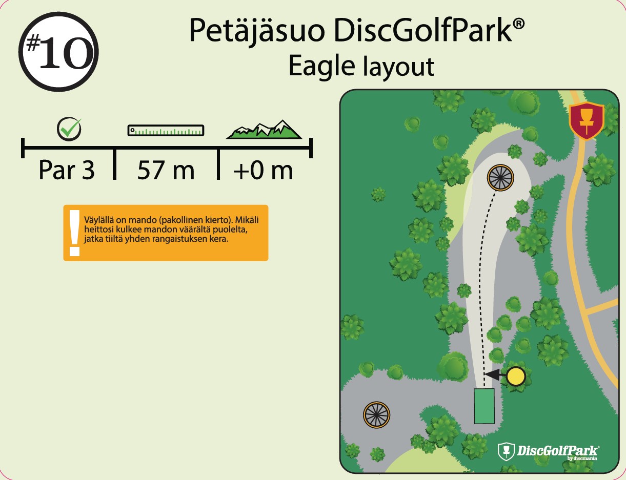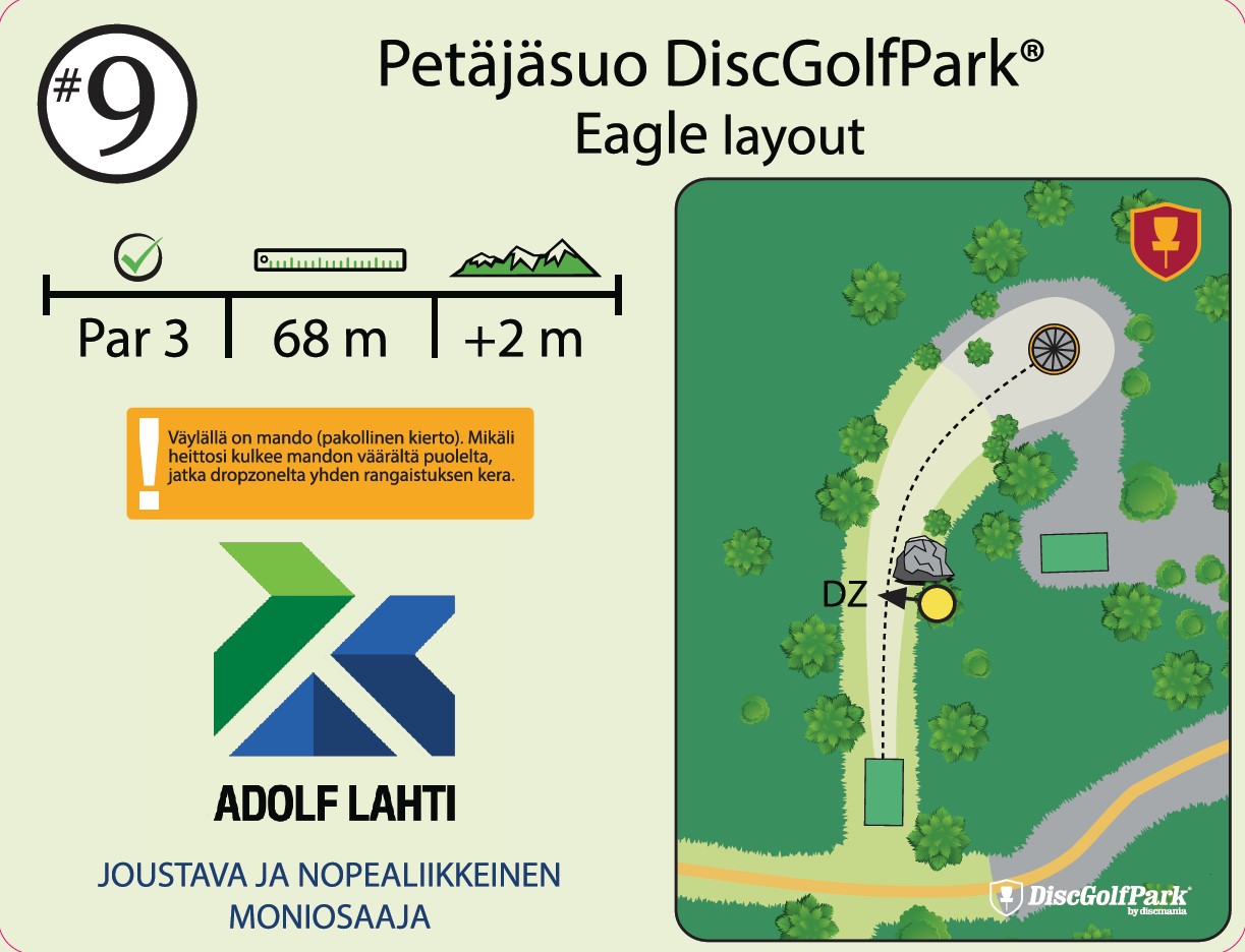 Väylällä mando kierrettävä vasemmalta. Mandomissistä jatko edelliseltä heittopaikalta rangaistusheiton kera. Väylä kaartaa hieman oikealle ja kori on matalan kallion kielekkeellä.