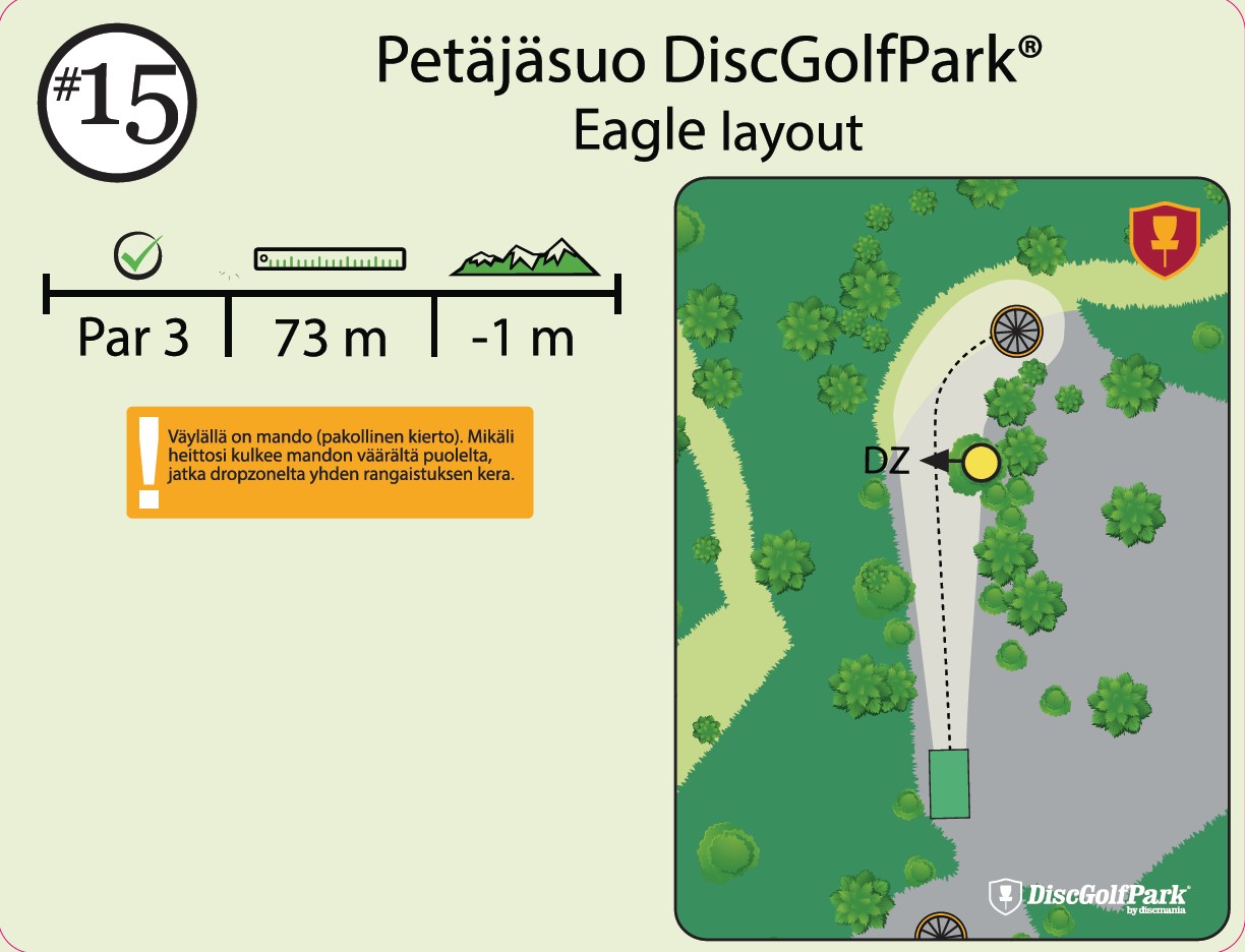 Väylällä mando joka kierrettävä vasemmalta. Mando missistä drop zonelta jatko rangaistusheiton kera. Väylä kaartaa mandon jälkeen oikealle kallion päälle.