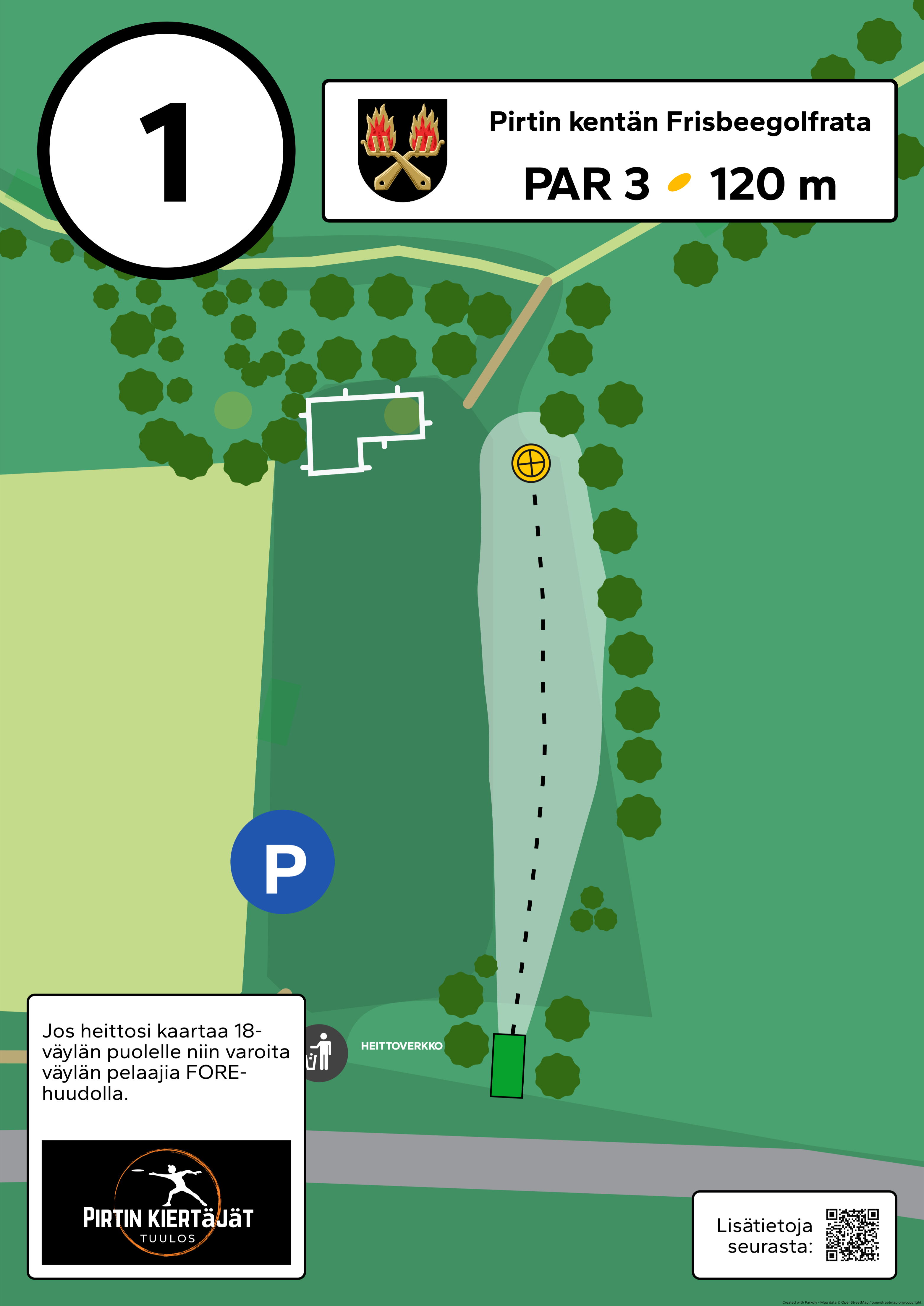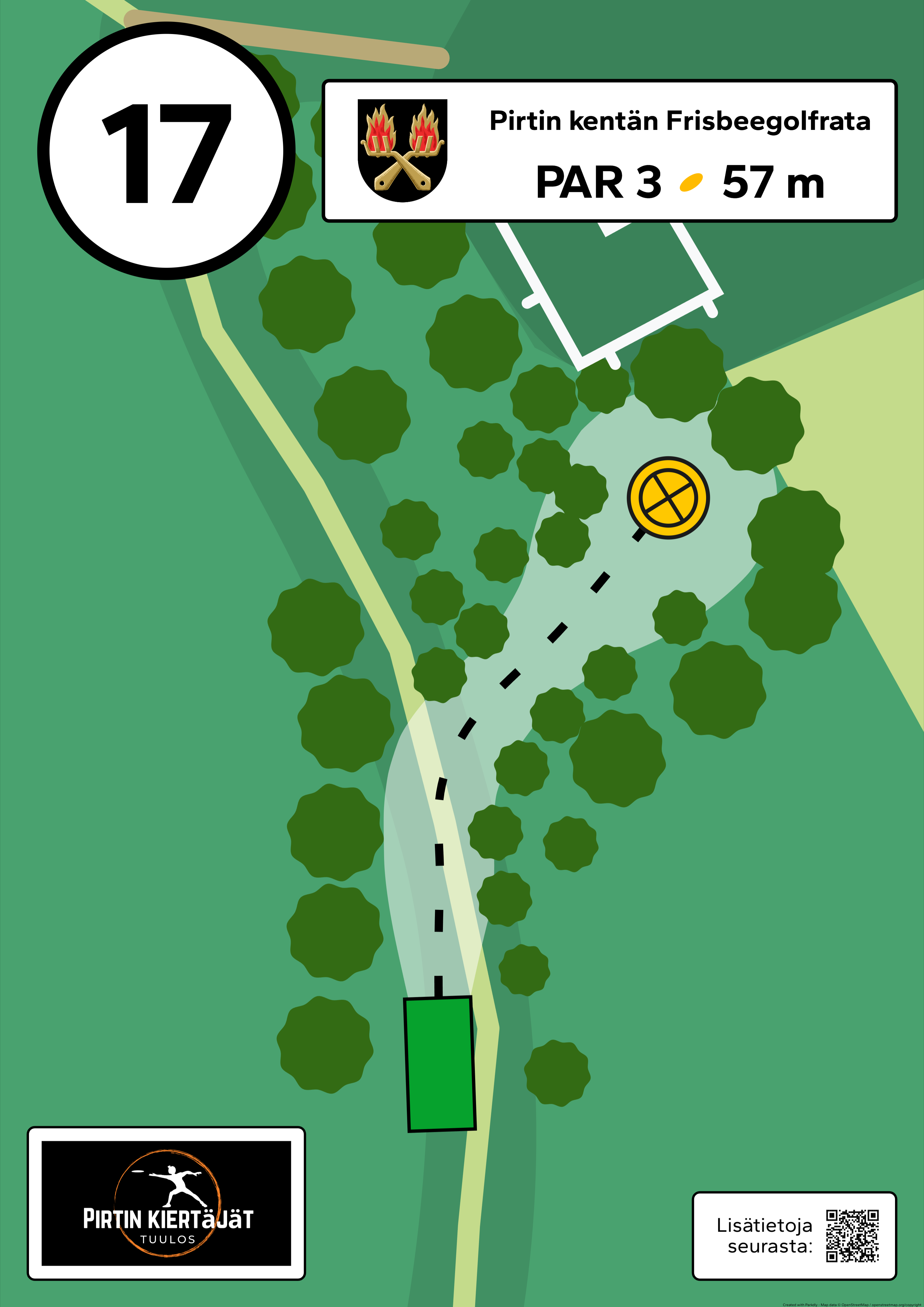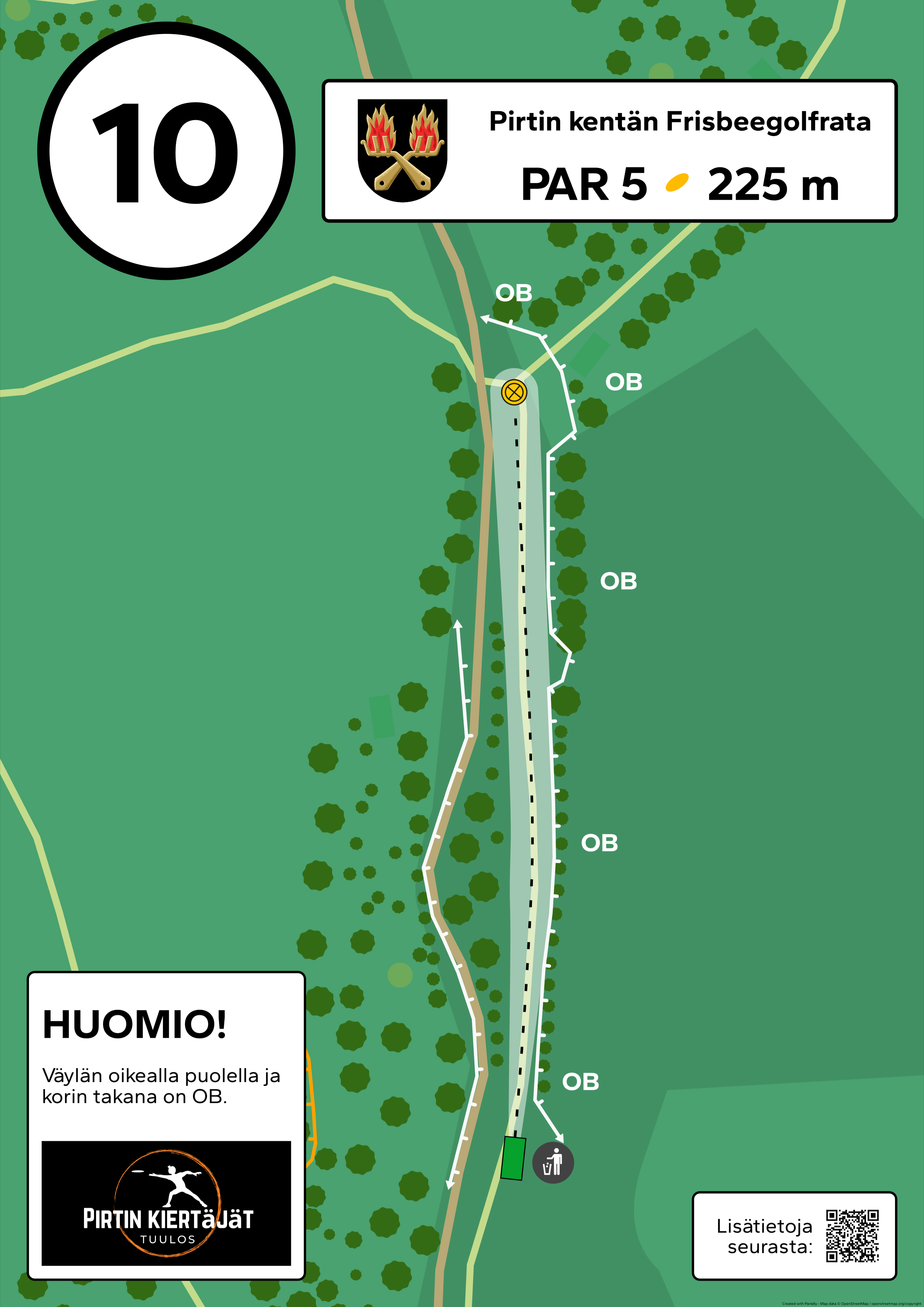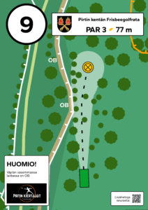 Korin takana oleva tie ja sen takana oleva alue on OB-aluetta. Jos kiekko menee OB-alueelle niin peliä jatketaan ylimeno-kohdasta ja tulokseen lisätään +1 heitto.