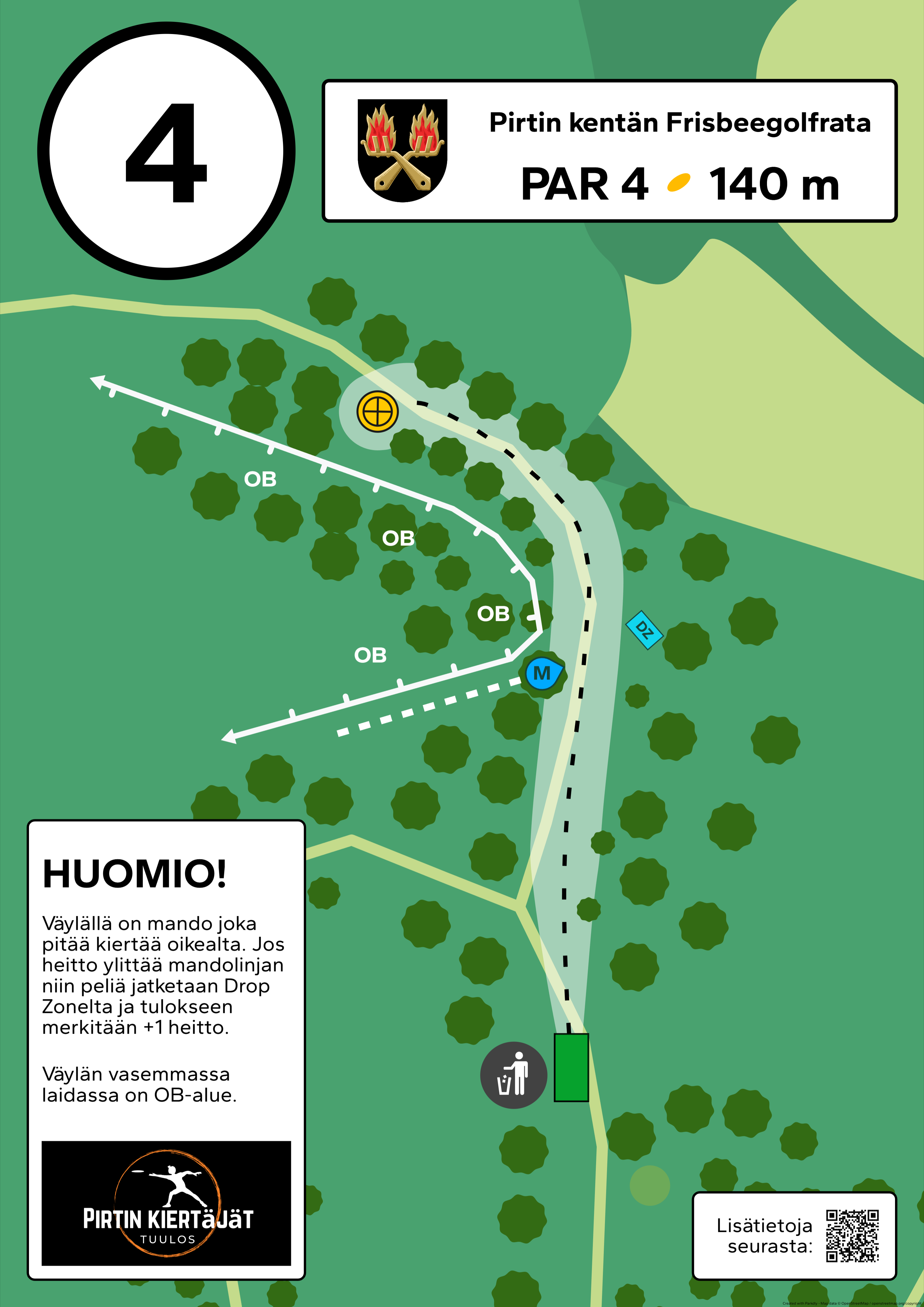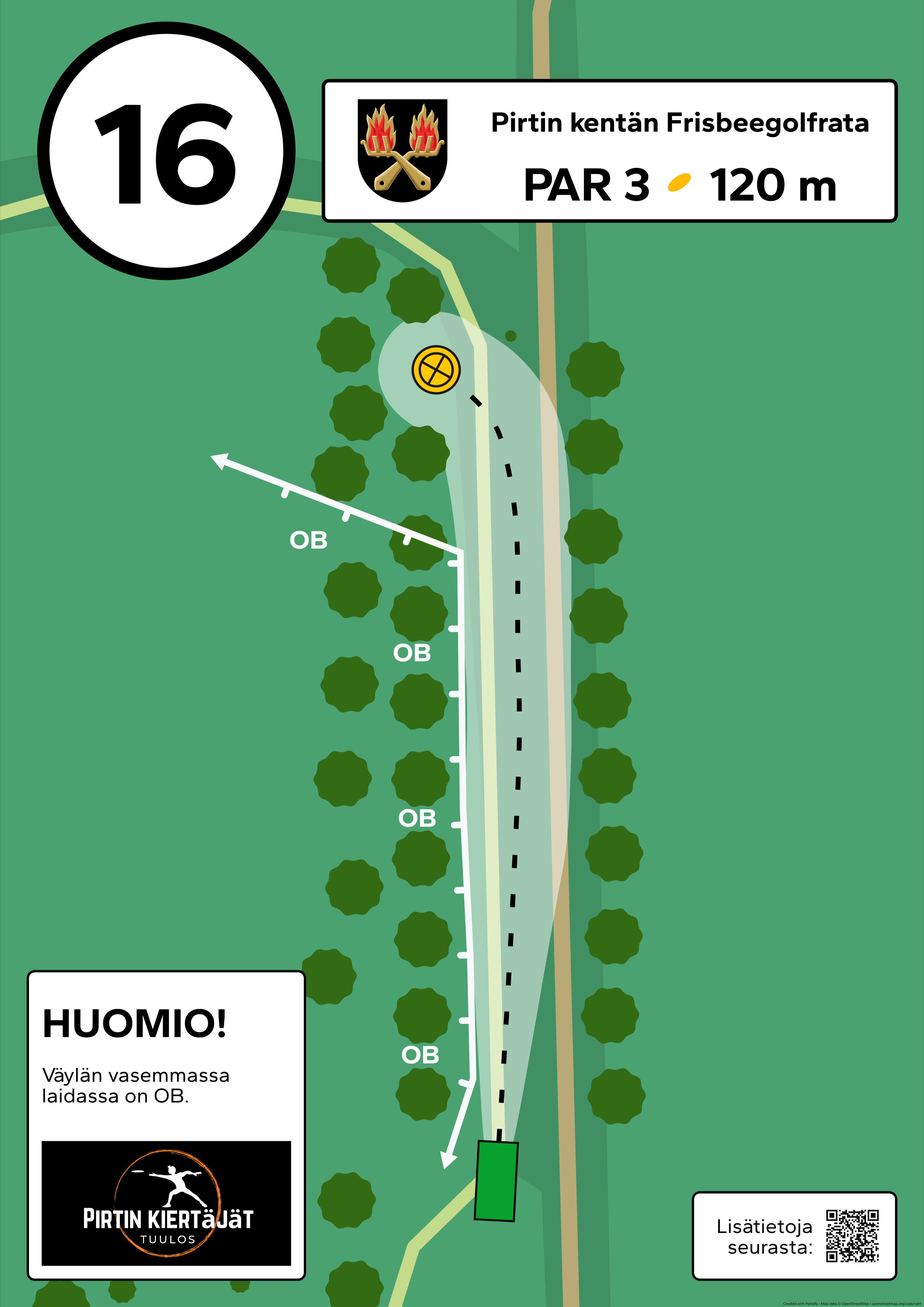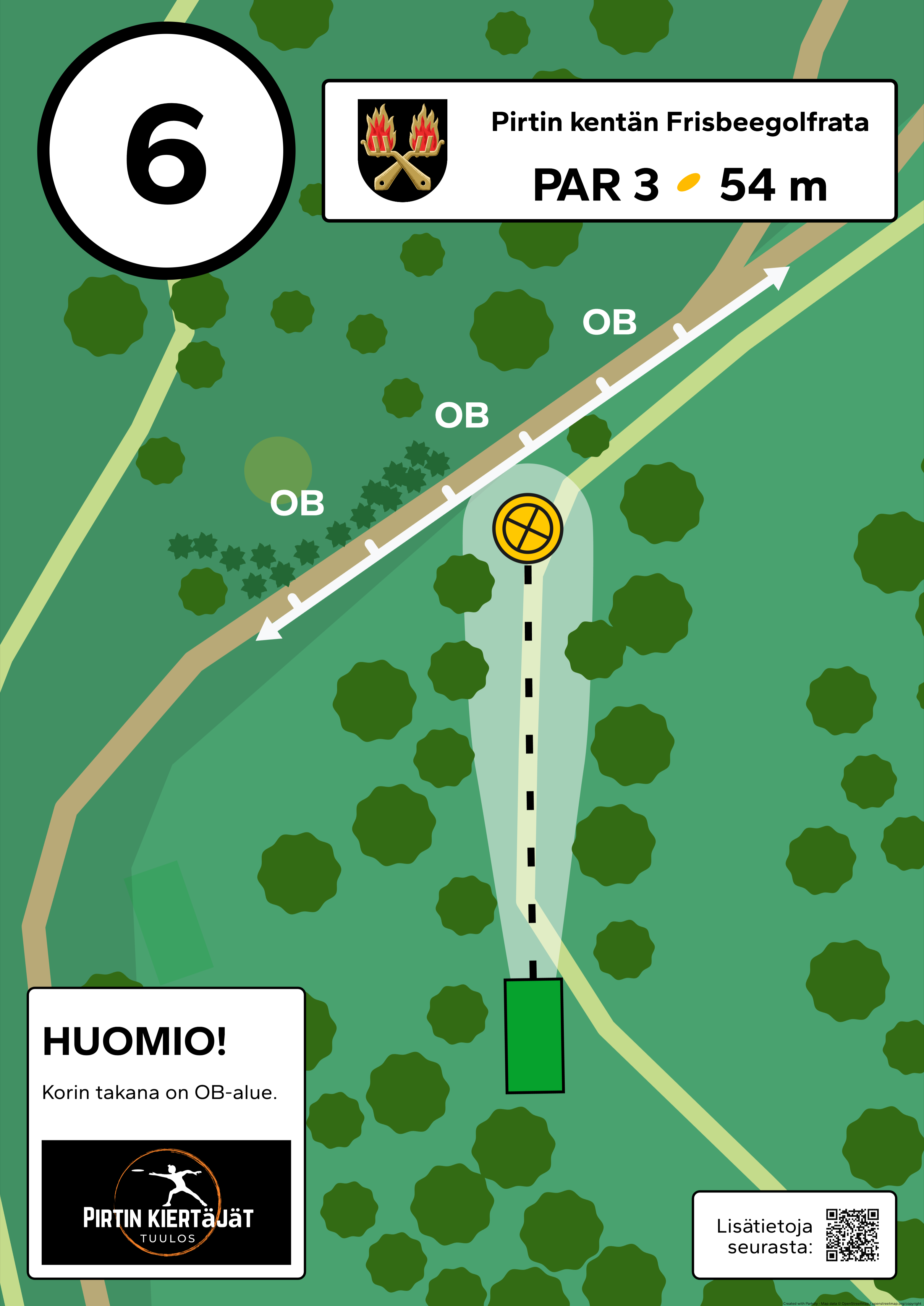 Väylän vasemmalla puolella menevä tie ja sen vasemmalla puolella oleva alue on OB-aluetta. Jos kiekko menee OB-alueelle niin peliä jatketaan ylimeno-kohdasta ja tulokseen lisätään +1 heitto.