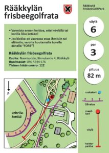 Rääkkylän kunnassa keskustan ja koulukeskuksen välittömässä läheisyydessä Rääkkylän frisbeegolfrata. Pituutta radalla 9-väylää (680m) ja B2-luokitus. Kiekon perässä tuli käveltyä 2400m. Rata pelattu 2.10.2020.