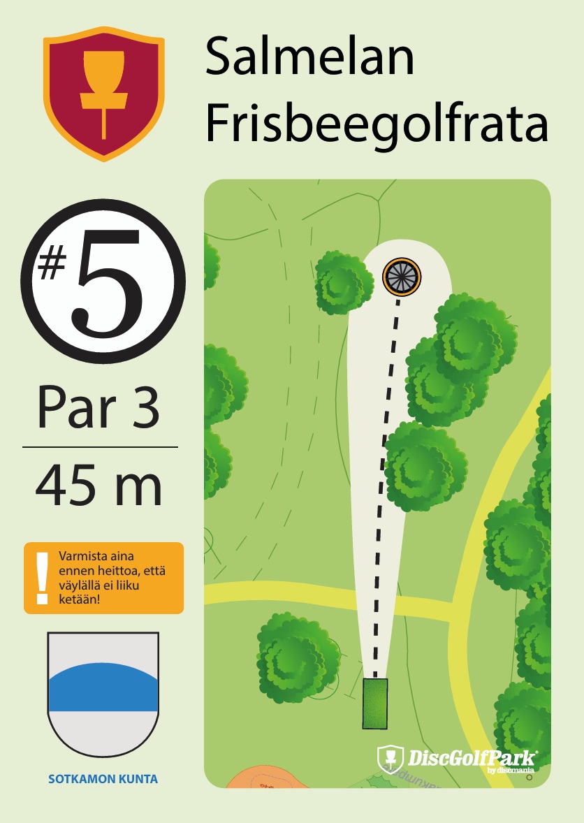 Salmelan puistorata ei korkeuseroja sisältänyt yhtään, joten kevyestä ulkoilusta kävi radan kiertäminen. Puistossa kulki paljon polkuja, mutta turvallisuus oli koko ajan hyvä, sillä näkyväisyyttä riitti kiitettävällä tavalla joka suuntaan. Lyhyttä, osin täysin esteetöntä ja helppoa väylää oli tarjolla. Voisi sanoa hyvällä syyllä aloittelijaystävälliseksi radaksi. Ja vesimaisemaa oli kauniisti tarjolla runsaissa määrin koko radan mitalta. Erityismaininta erittäin fiksusti suunnitellusta 3-väylästä. Tarjolla oli tuolla väylällä paremmille pelaajille lyhyt vedenylitys, mutta amatöörejä ajatellen oli rakennettu myös b-vaihtoehto mikä meni kuivalla maalla koko ajan ja vielä oma korinsakin oli. Ei ahdistanut tällä kertaa satunnaista fribaturistia tämä vesiväylä…