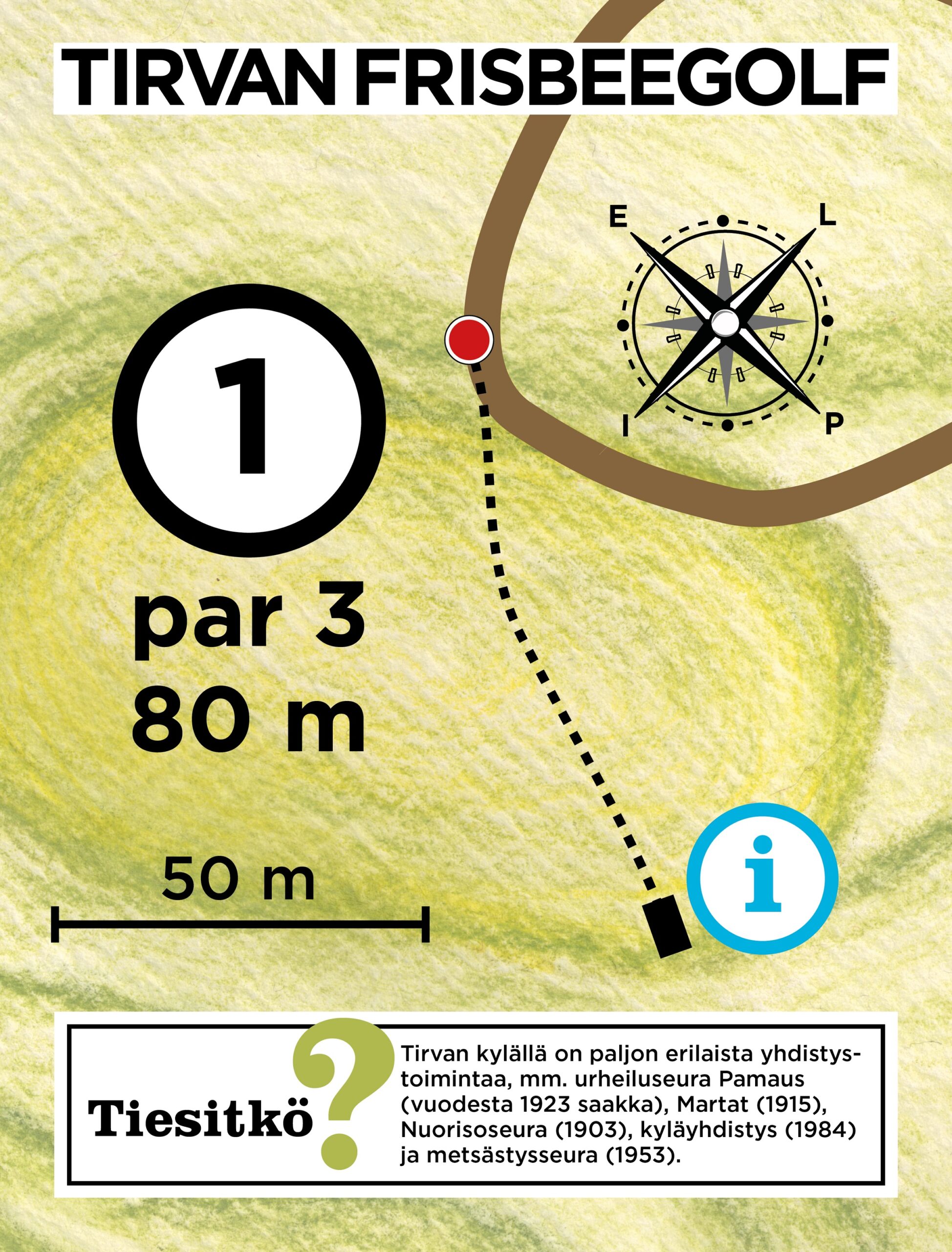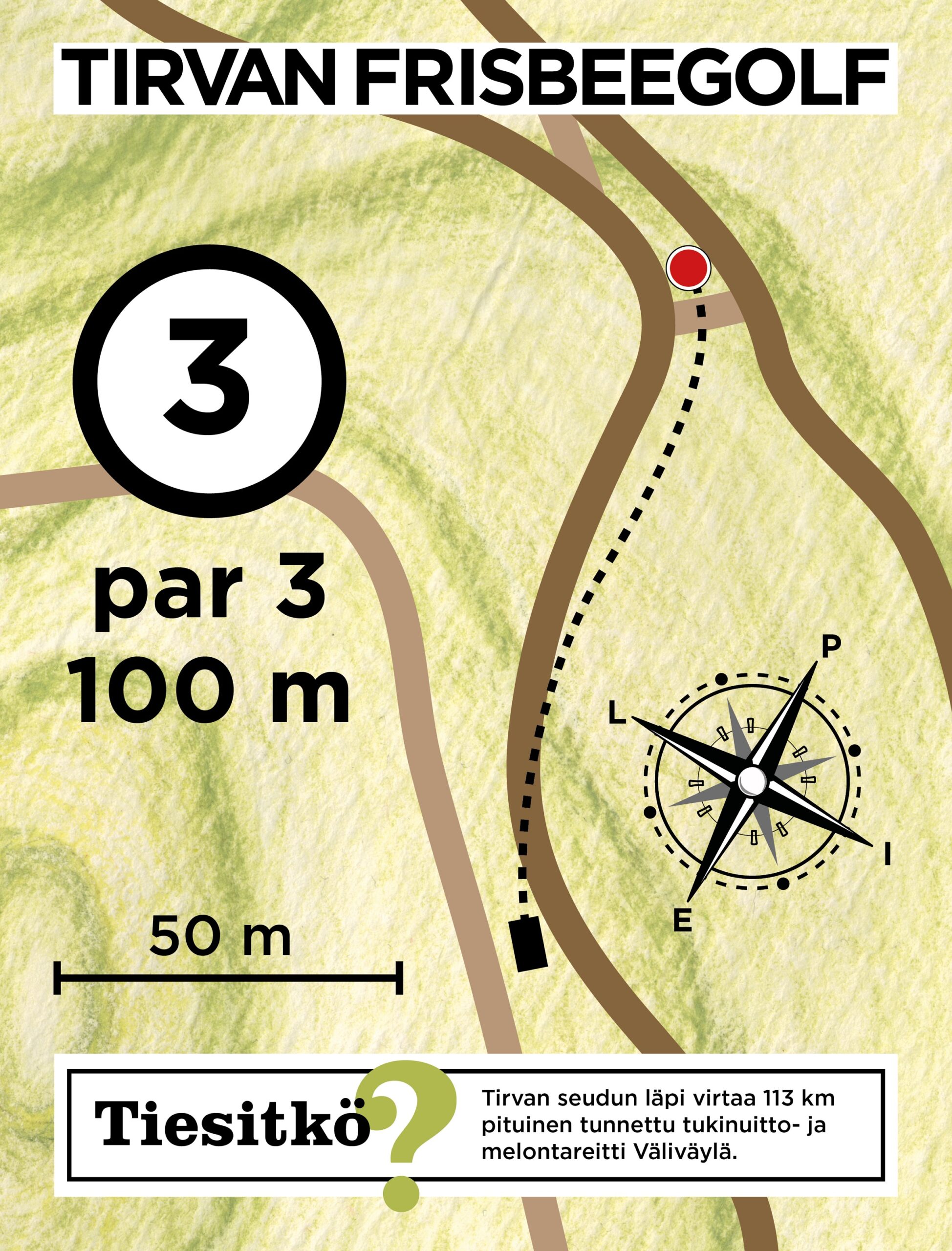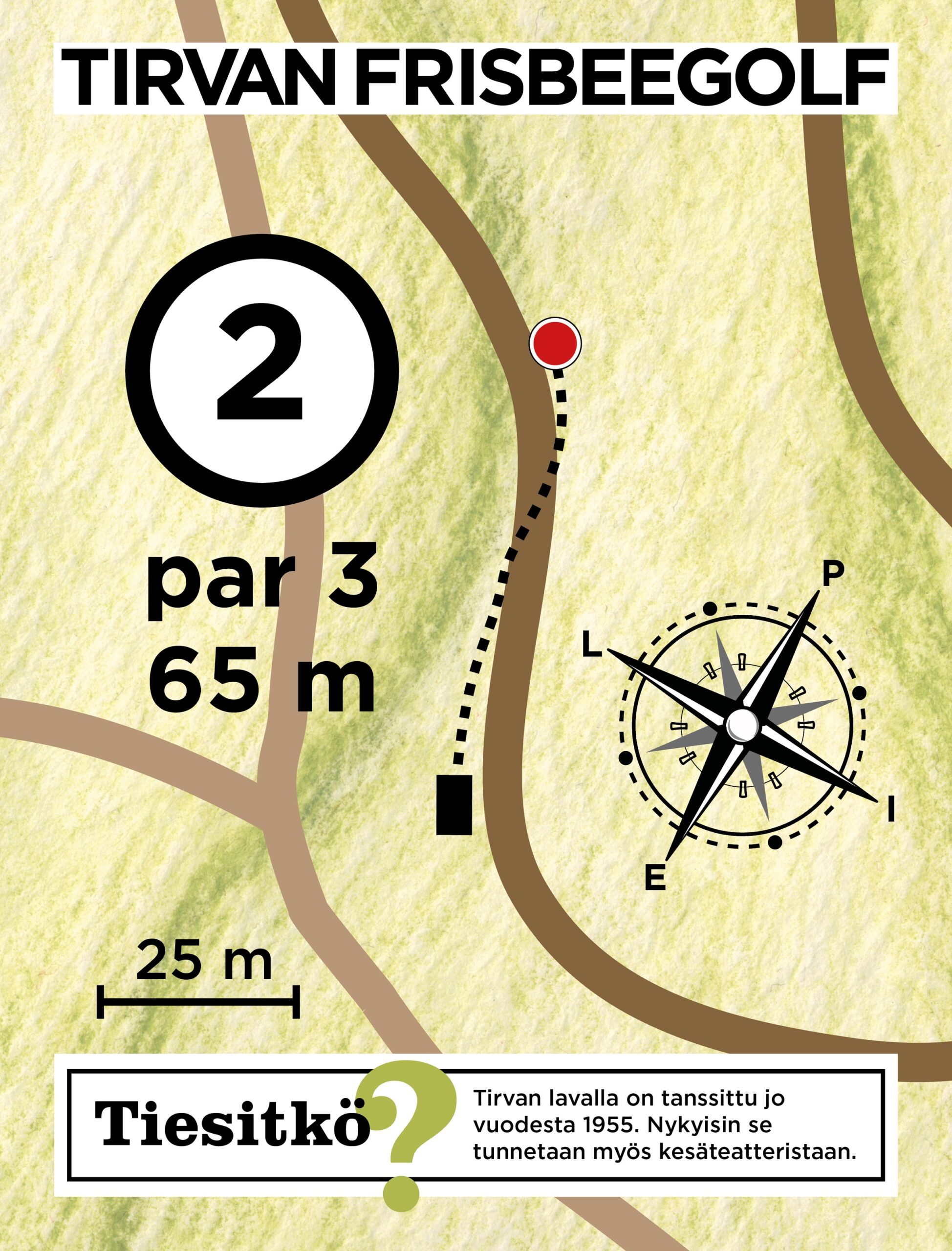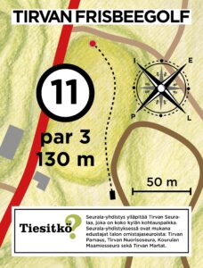 Lataa Tirvan frisbeegolfradan tuloskortti ja tulosta se mukaan kierrokselle joko pdf tai jpg-muodossa.