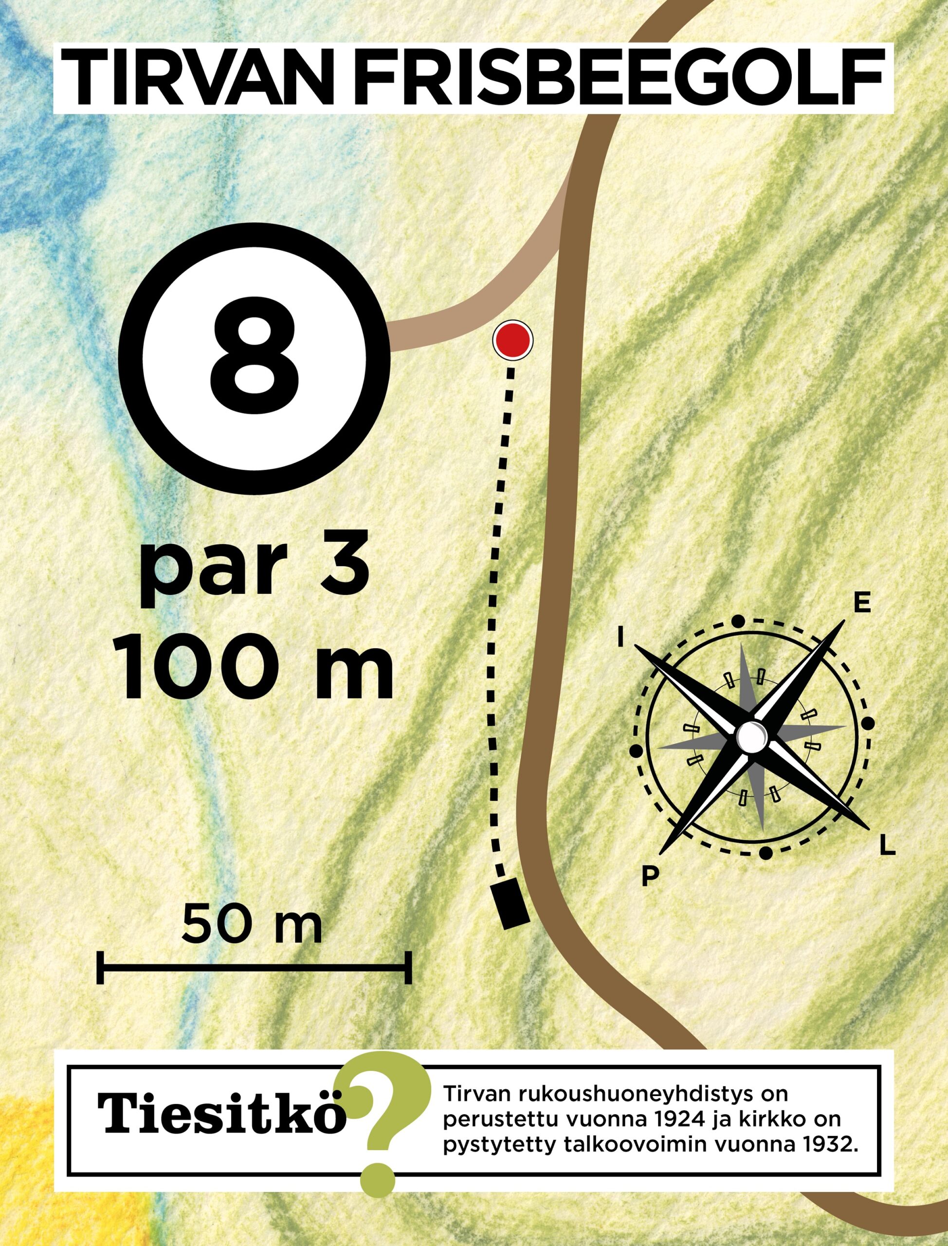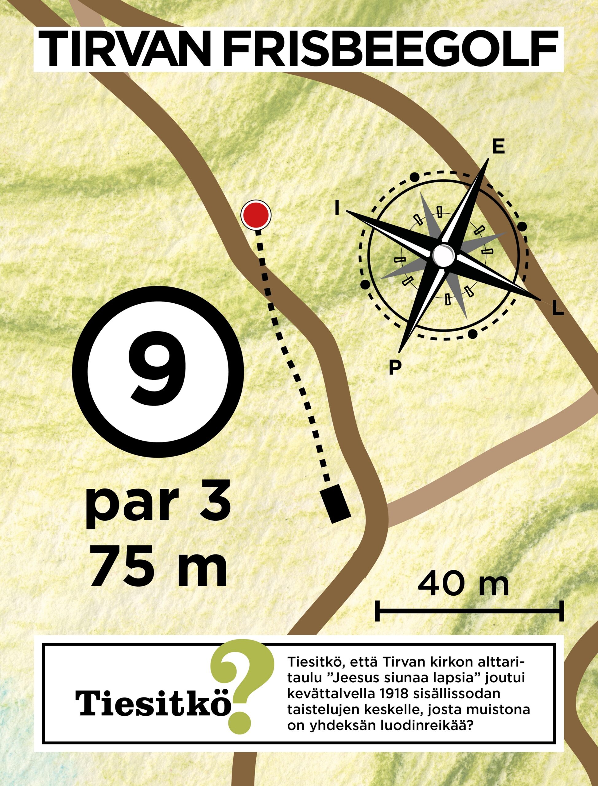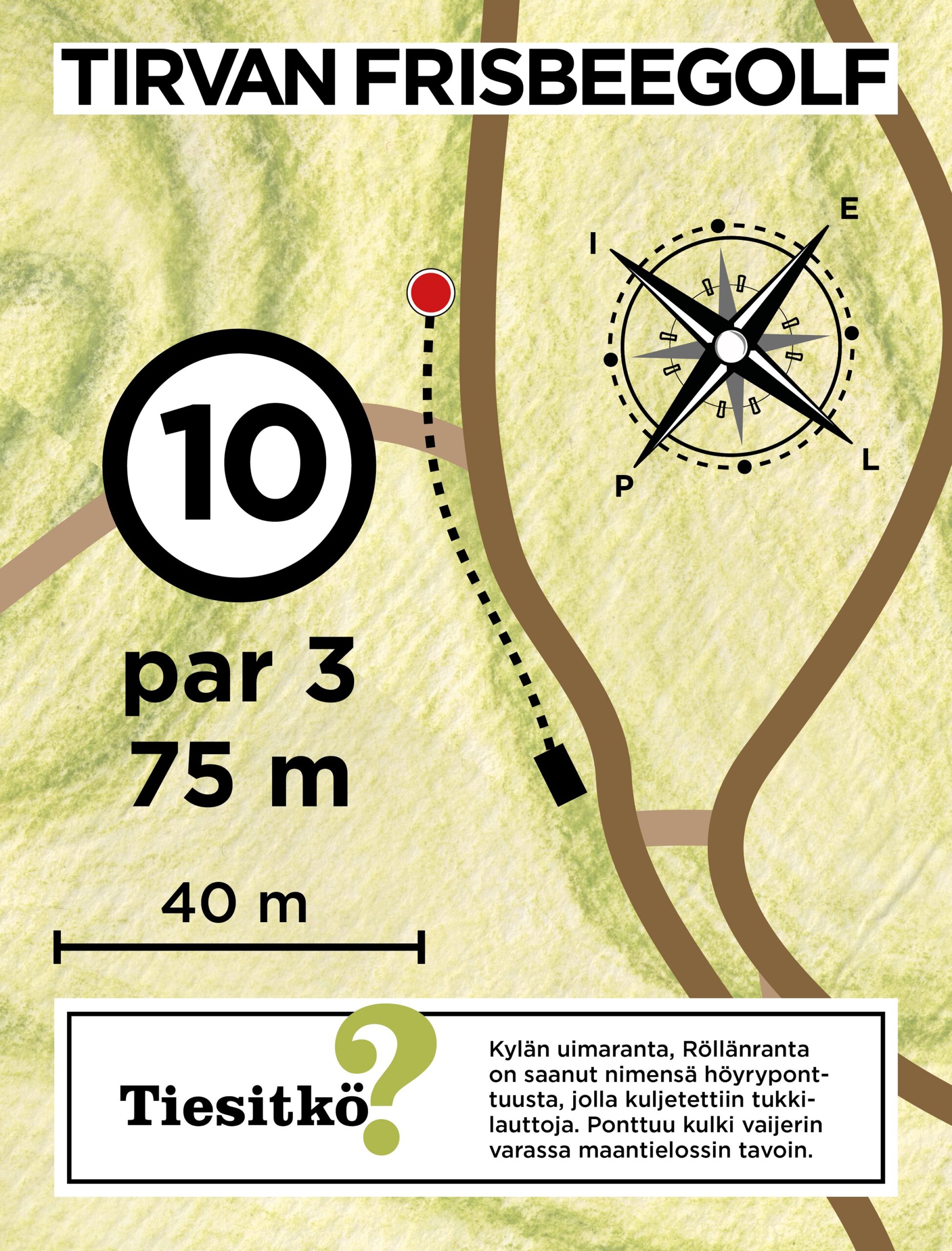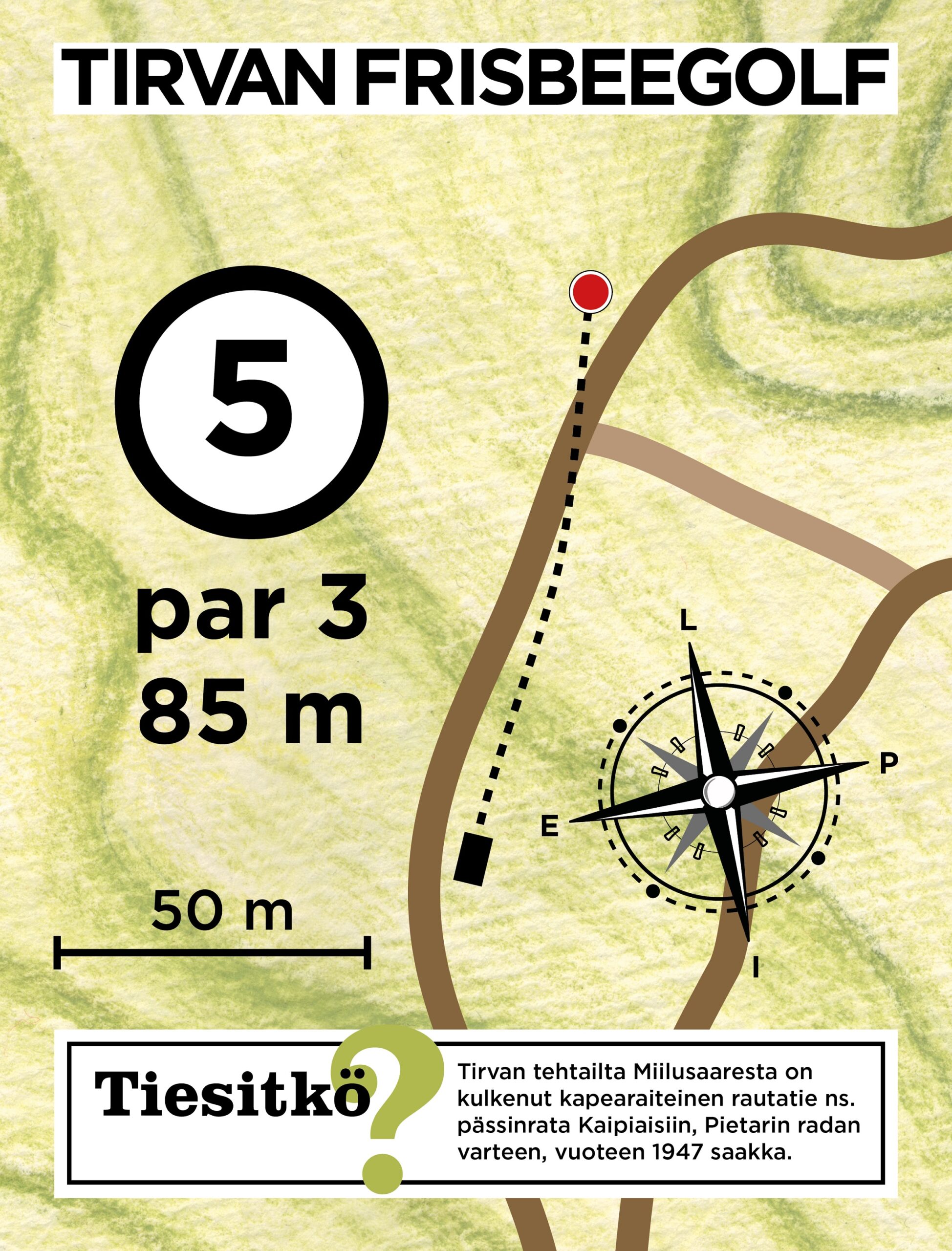 Lataa Tirvan frisbeegolfradan tuloskortti ja tulosta se mukaan kierrokselle joko pdf tai jpg-muodossa.
