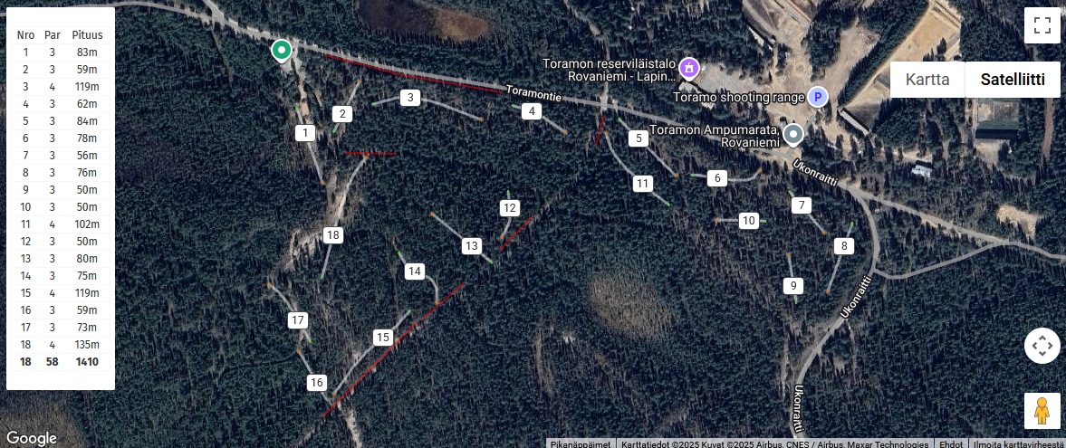 Hieno ja monipuolinen rata komeassa maastossa. Pärjätäkseen pitää olla heitot monipuolisesti hallussa. Paikoittain puita on aika reippaasti ja mahdollisuus päästä testaamaan mielikuvitustaan pelastaessaan suoritustaan tiheästä metsästä takaisin väylälle. Suosittelen vierailemaan. Varokaa poroja 🙂
