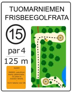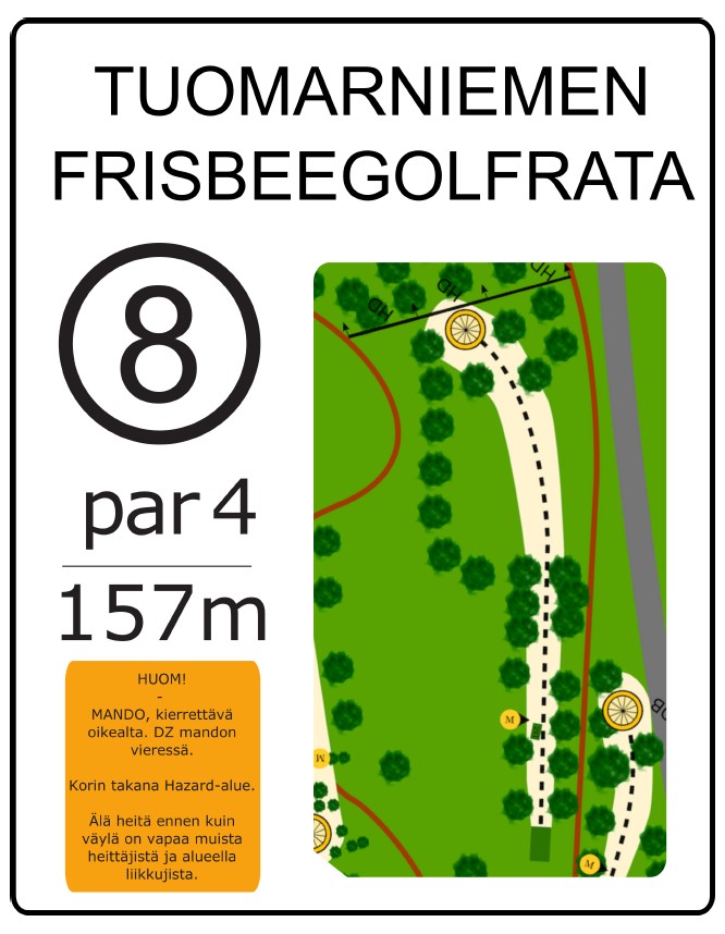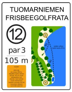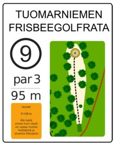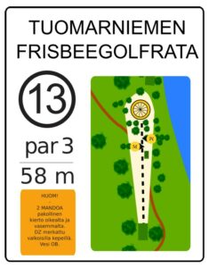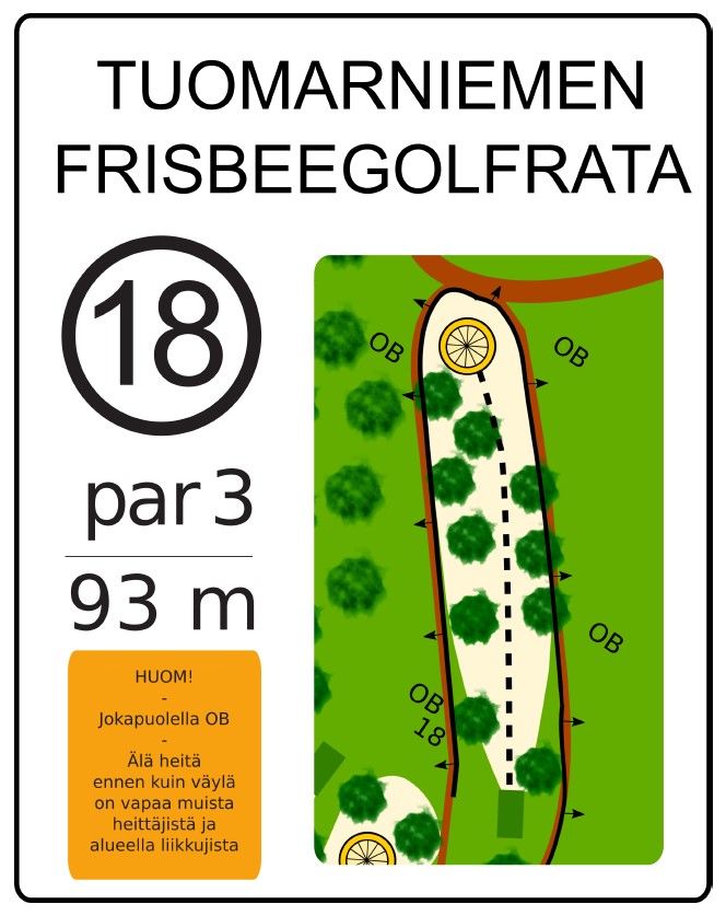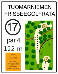 Väylä 18 on hyvä esimerkki: tikutetaan koko väylä tiiltä korille vasemmalle ja oikealta korille kaventaen. Heittämällä sopivasti puuosuman alussa saatat päätyä OB:lle ja siitä rankkua. Lisäksi saat mahdollisesti huonon jatkopaikan ja voit kirjoittaa vähintään tuplan korttiin. Ainoa järkevä peli on hyssepommi oikealta ja toivotaan samalla väyläosumaa. Keskeltä ei kannata pelata. 😀 Samat fiilikset jäi väylän 13 porttimandosta, väylällä ei ole liikaa vaihtoehtoja pelille. Putterilla portille ja siitä putterilla korille = nostopar.